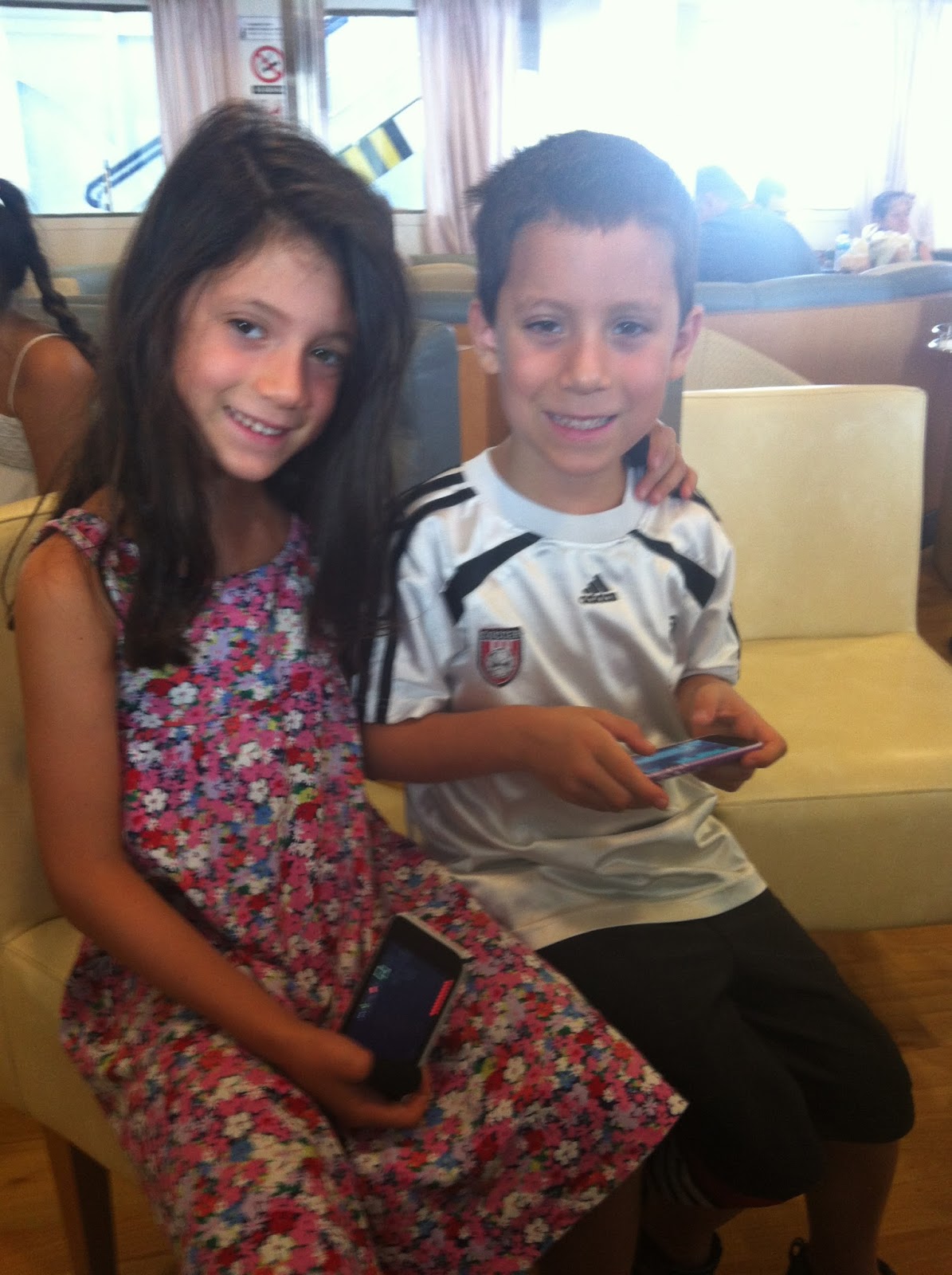 Kids on Ferry Boat, in our little seating area, iTouches in hand